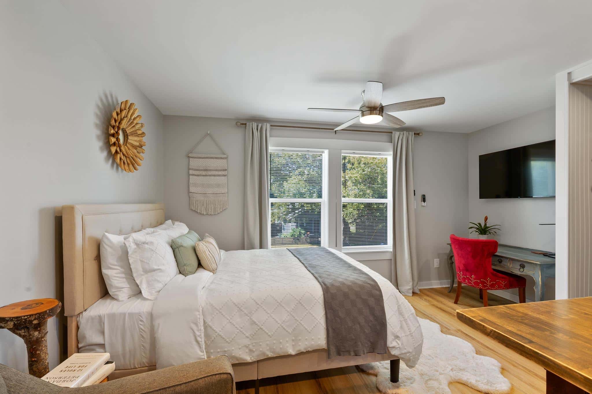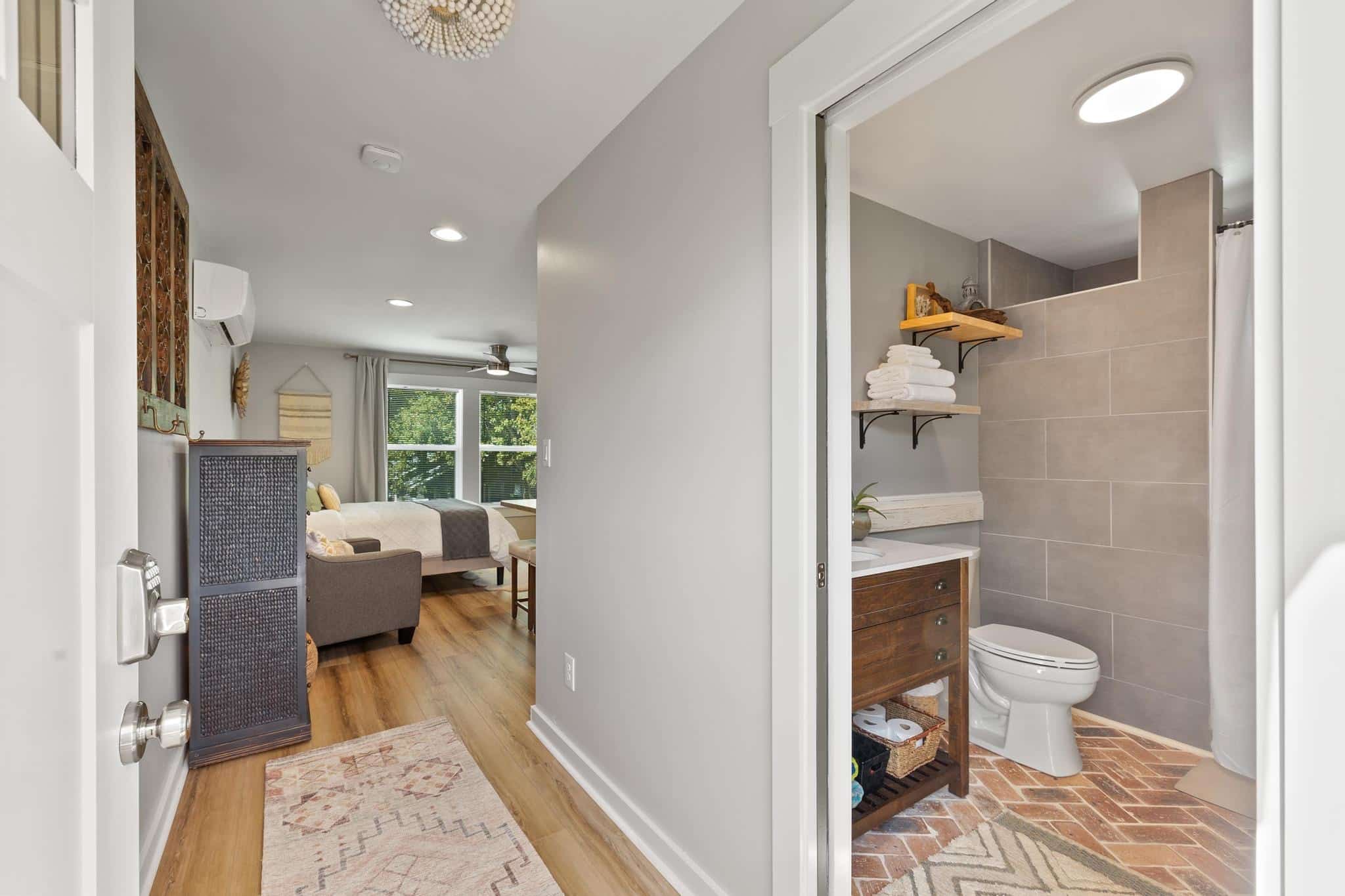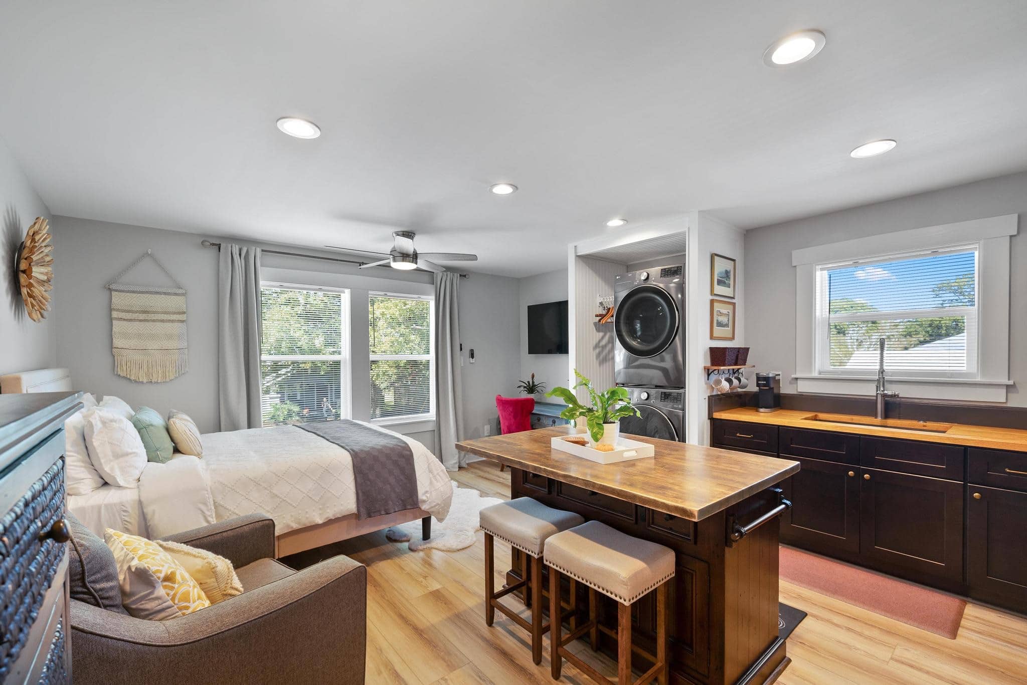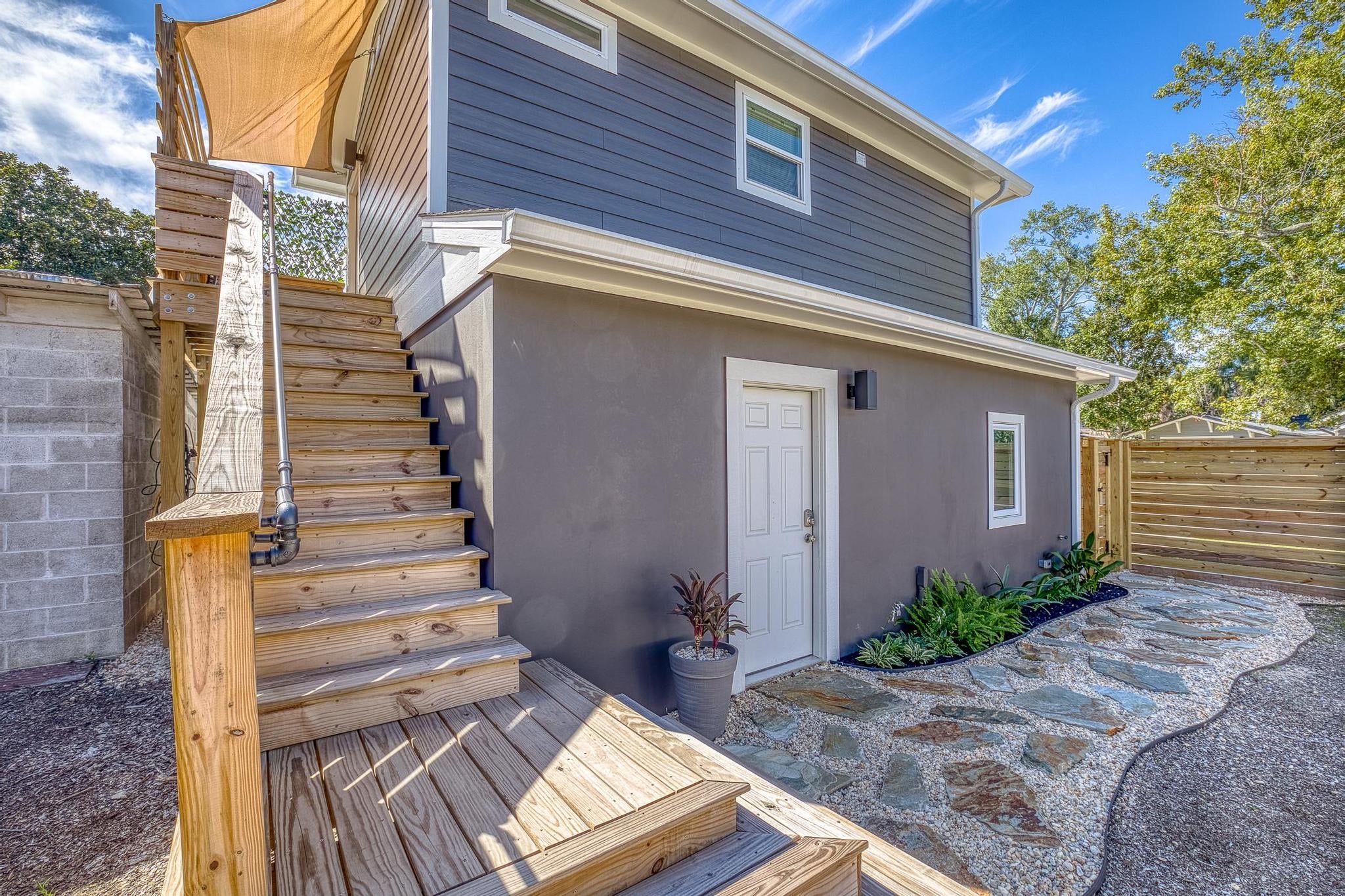 Situated above a brand-new garage in the heart of Pensacola’s historic East Hill neighborhood, The Casita merges cozy charm with fresh modernity, ideal for those seeking a peaceful haven close to the city’s lively attractions. This delightful property features a welcoming facade and is surrounded by vibrant greenery, creating a perfect backdrop for relaxation and rejuvenation. Inside, guests are greeted by a tastefully decorated space where rustic touches meet sleek, contemporary design, offering a homely and inviting atmosphere.