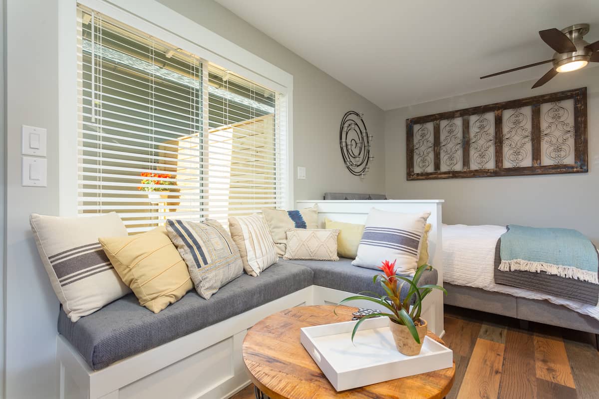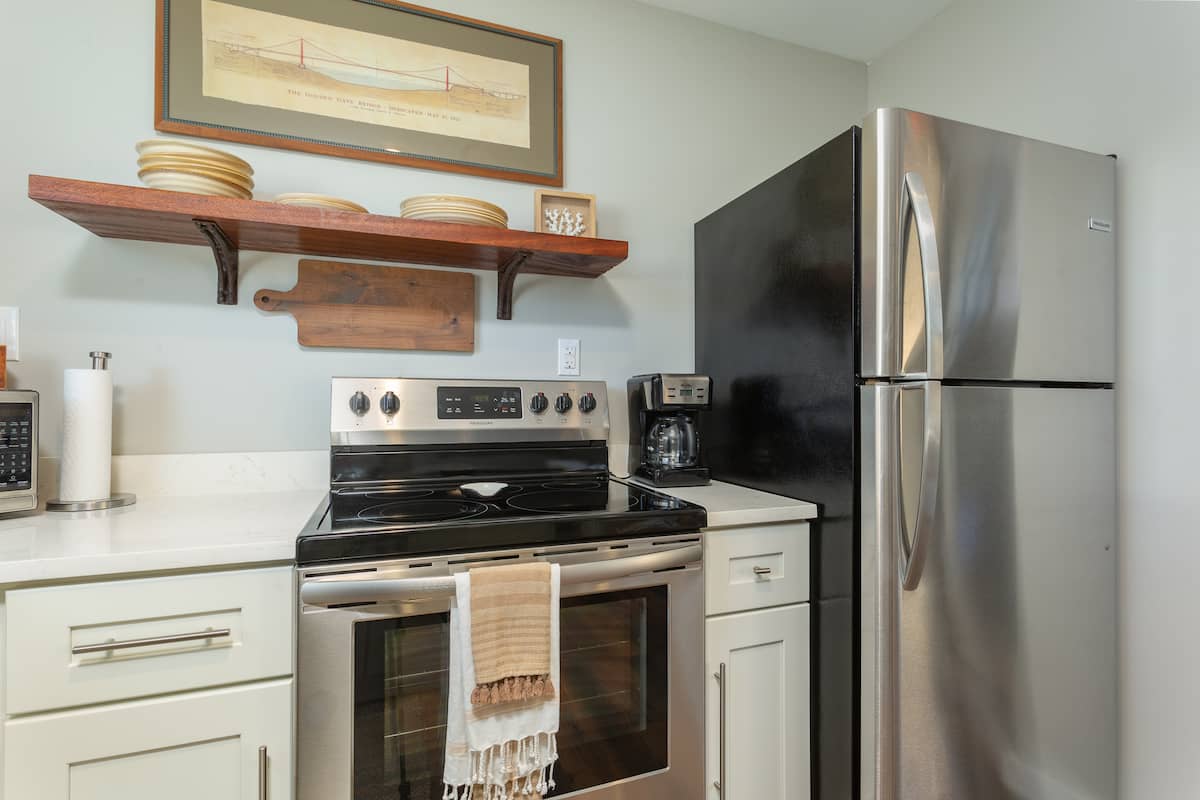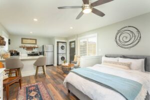 Attention to detail is evident throughout The Studio. Guests will appreciate the high-quality linens, plush towels, and the meticulously maintained cleanliness that East Hill Ivy is known for. The studio’s contemporary aesthetic is complemented by local artwork, adding a touch of Pensacola’s rich culture to the serene ambiance. For those who need to stay connected, high-speed Wi-Fi and a dedicated workspace provide the perfect setup for remote work or planning the next day’s adventures.